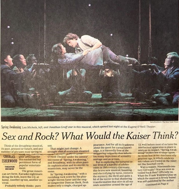 Summary: Spring Awakening is a rock musical Set in 19th-century Germany, follows teenagers struggling with puberty, sexuality, and strict societal rules. Melchior and Wendla begin a relationship, while their friend Moritz collapses under academic pressure. The musical explores themes of repression, miscommunication between adults and teens, and the painful journey into adulthood.
